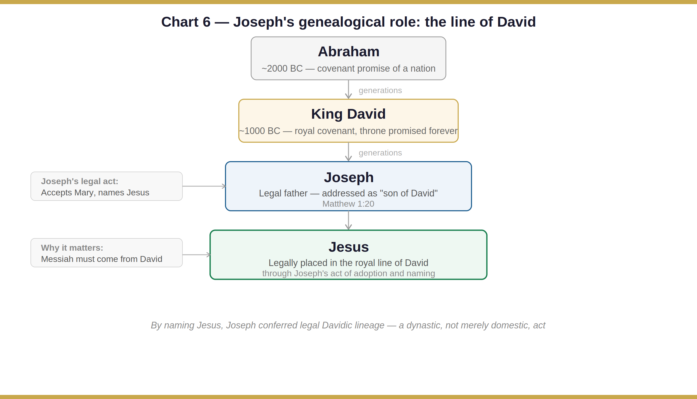 Then comes the dream. The angel addresses Joseph as “son of David,” and that phrase is doing real work. Matthew has just spent seventeen verses tracing Joseph’s lineage through the royal line. By accepting Mary and naming the child, Joseph doesn’t just become a husband and a father. He formally places Jesus in the legal line of David, fulfilling the messianic covenant that the promised king would come through that royal bloodline.