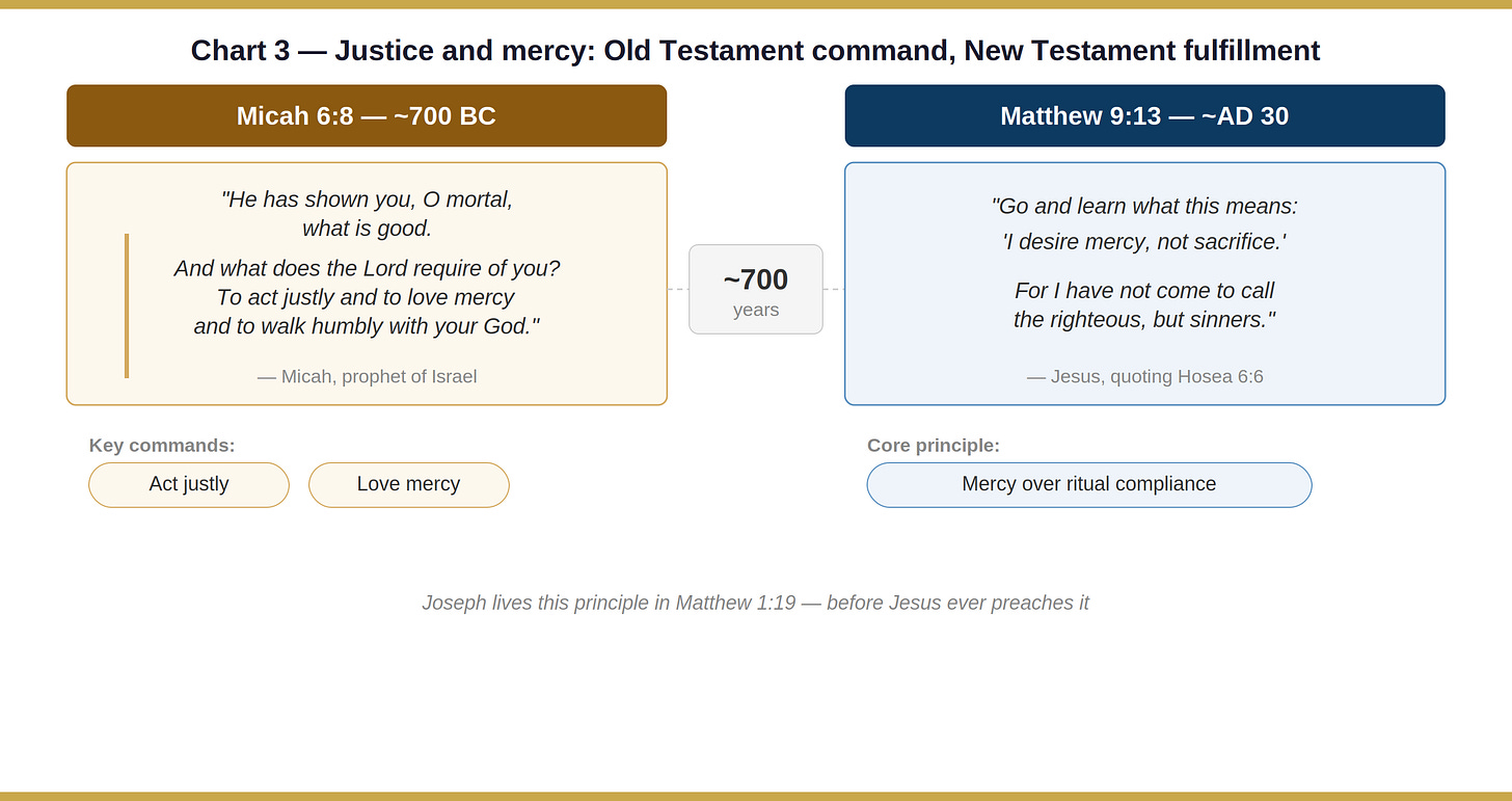 There’s something worth sitting with here. The prophet Micah wrote centuries earlier that God requires us to “act justly and to love mercy,” not one or the other, but both at once. That’s a harder balance to strike than it sounds. Most of us lean one way. Joseph, before Jesus ever preaches it, before grace has a face and a name, gets it right. He sees a human being he loves and refuses to make her a case study in law enforcement.