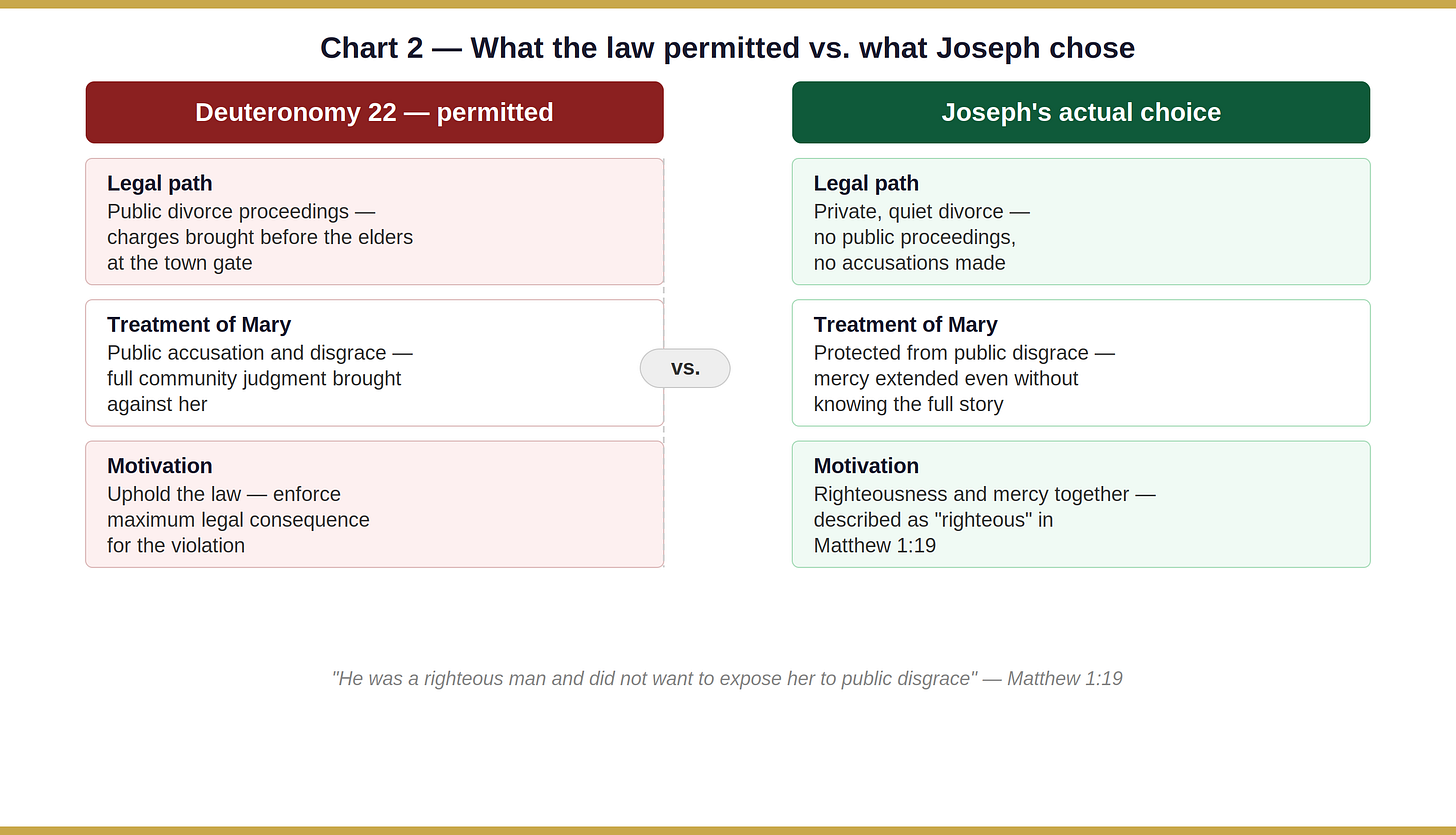 So when Mary turns up pregnant, Joseph isn’t facing an awkward conversation. He’s facing the collapse of everything: his reputation, his future, and his understanding of the woman he loved. Deuteronomy 22 gave him legal standing to bring public charges. The community would have expected nothing less.