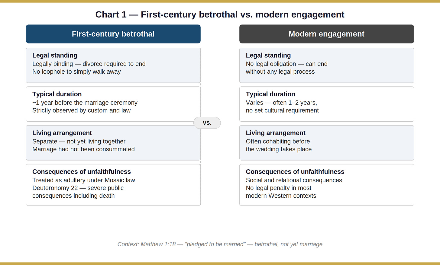 We can’t feel the weight of Joseph’s situation until we understand what betrothal actually meant in first-century Jewish culture. This was not a modern engagement — no ring, no party, no easy exit. Betrothal was legally binding. It typically lasted about a year, during which the couple lived separately but were considered, in the eyes of the law and the community, husband and wife. To end it required a formal divorce. To violate it was, under Mosaic law, treated as adultery.