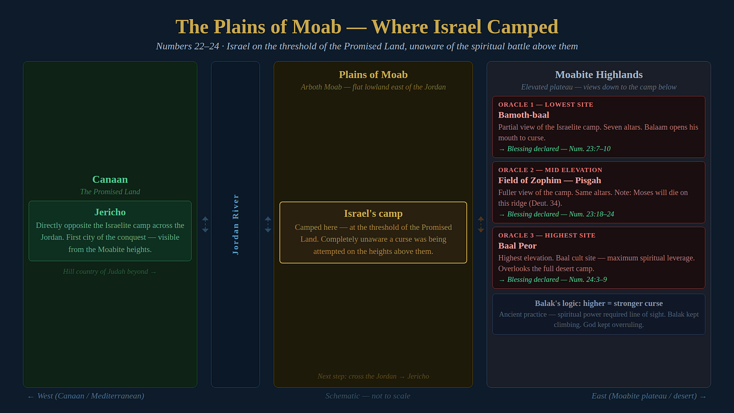 Israel is camped on the plains of Moab, right on the edge of the Promised Land. The Jordan River is in front of them. Jericho is visible across the water. After forty years in the wilderness, they are this close. And they have no idea that on the heights above them, a king named Balak is in a panic, and a prophet named Balaam has just been hired to destroy them before they ever cross that river.