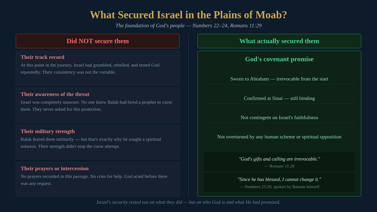 But here’s what holds all of this together, and it’s the most important piece: what actually protected Israel in the plains of Moab wasn’t their prayers, their awareness, their faithfulness, or their track record.