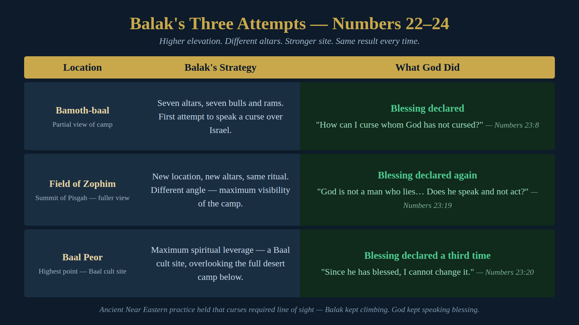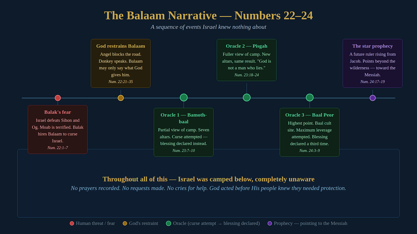 That detail should catch our attention. Because most of us live as though God’s protection is reactive, as if He waits for us to notice the threat, name it, and ask before He moves. But that’s not what happens here. Balak plots. Balaam saddles his donkey. And God, without any prompting from His people, quietly dismantles the whole scheme. Every time Balaam opens his mouth to curse, blessing comes out instead. Three locations. Three altars. Three attempts. Same result every time.