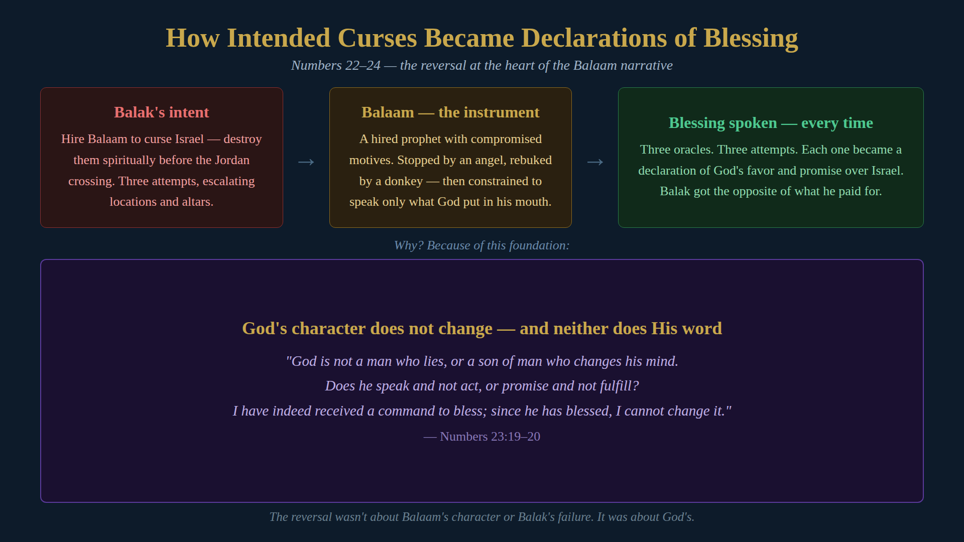 That word from Balaam’s own mouth, spoken by a hired enemy standing on a pagan high place, is one of the most remarkable testimonies to God’s faithfulness in all of Scripture. He can’t curse them. Not because Israel is so righteous. Because God has blessed them, and that blessing cannot be changed.